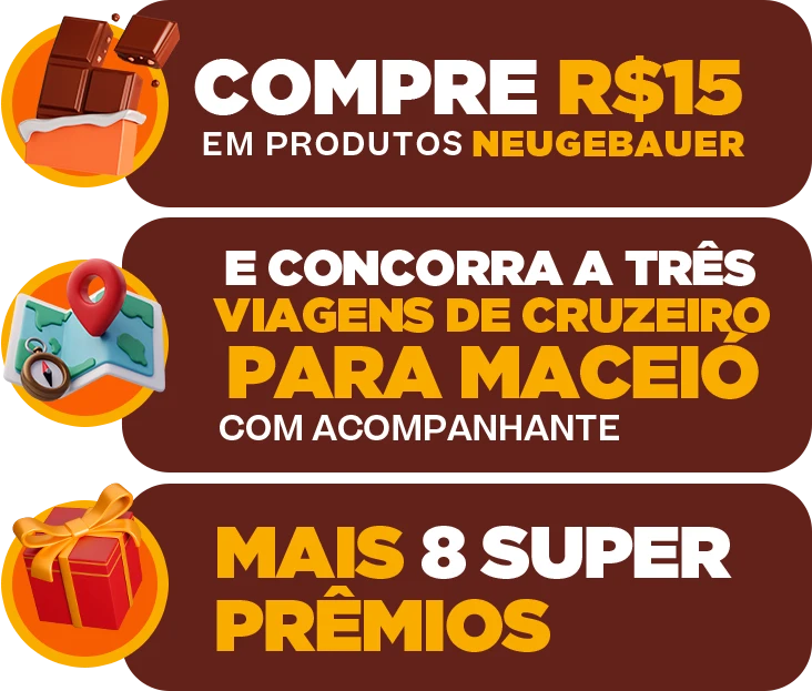 Todos os produtos da marca Neugebauer são válidos na promoção: Stikadinho, Bib’s, Nóig, 1891, Refeição, Napolitano, Amor Carioca, Barras Neugebauer e Mu-Mu.